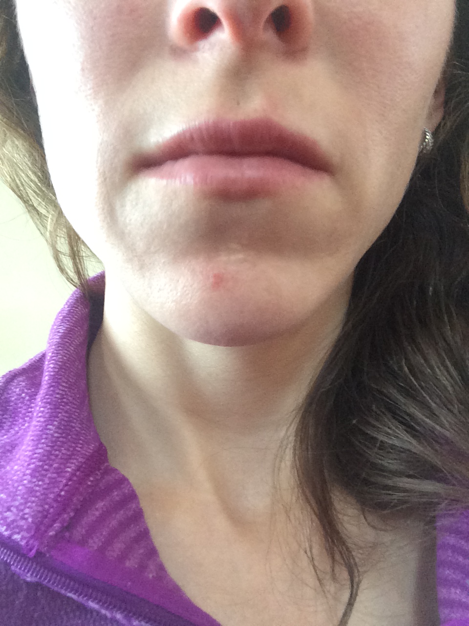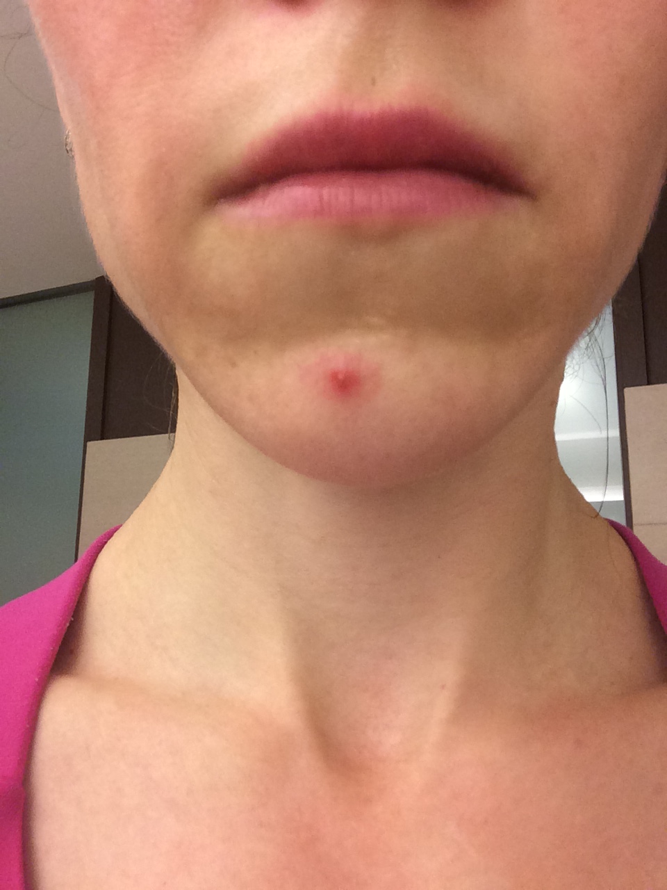 Afraid of shots? I don’t like them either, but it is virtually painless and MUCH less painful than the zit on my chin. So keep your dermatologist on speed dial for the next time you wake up with huge pimple. Below, for your viewing pleasure, is my own photo journal of a zit succumbing to kenalog.